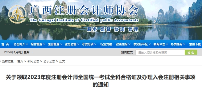 2024年1月8日,广西注册会计师协会发布了《关于领取2023年度注册会计师全国统一考试全科合格证及办理入会注册相关事项的通知》,明确了2023年广西注册会计师领取证书时间是2024年1月8日至3月31日。
