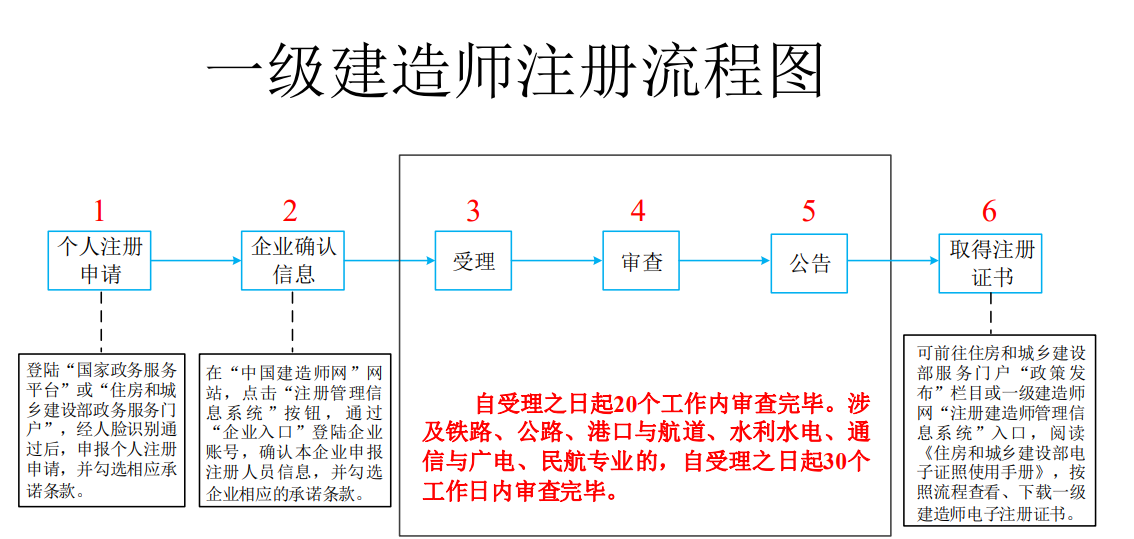 一级建造师注册流程:个人注册→企业确认信息→受理→审查公告→取得注册证书