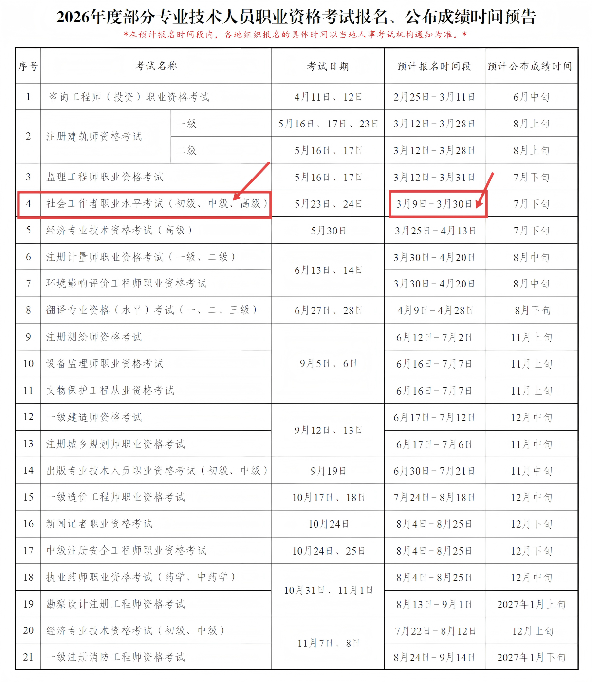 中国人事考试网2月28日发布了《2026年度专业技术人员职业资格考试重要事项提示》,其中明确了2026年社会工作者考试报名时间确定为3月9日-3月30日。