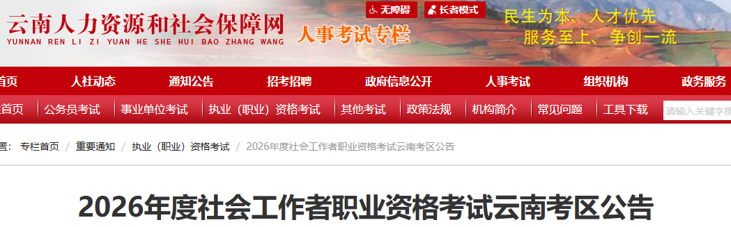 根据人力资源和社会保障部人事考试中心《关于2026年度社会工作者职业资格考试考务工作的通知》(人考中心函〔2026〕2号)文件要求,现将有关事项公告如下: