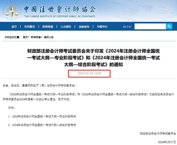 参考2024年注册会计师考试大纲于2月28日14:30公布,以下是2024年注册会计师考试大纲公布截图: