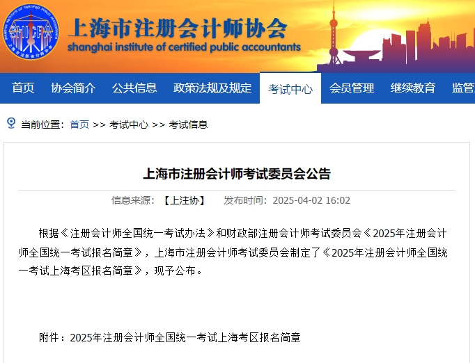 4月2日,上海市注册会计师协会发布了《2025年注册会计师全国统一考试上海考区报名简章》,明确了2025年上海注册会计师报名时间为4月8日-30日,交费时间为6月16日-30日,考试时间为8月23日-24日。