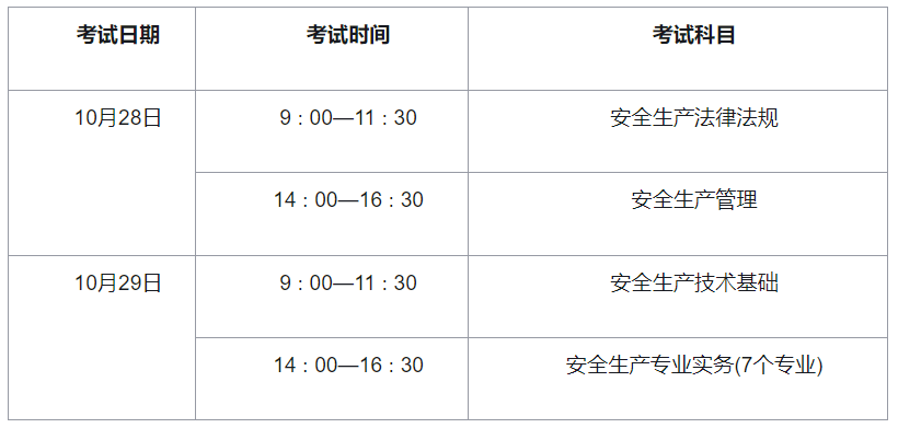 中级注册安全工程师考试于2023年10月28日至29日举行,具体安排如下: