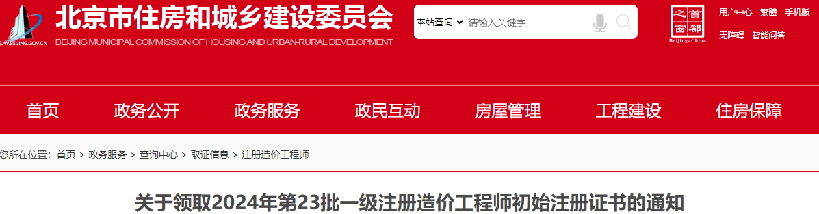 北京市2024年第23批一级造价工程师初始注册证书领取通知原文如下: