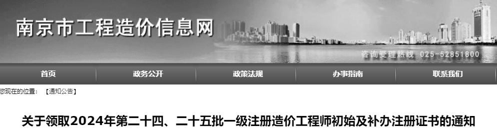 南京市2024年第24批、25批一级造价师注册证书领取通知原文如下: