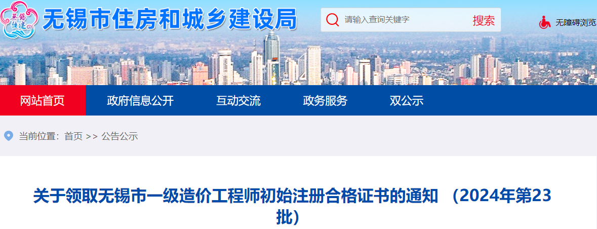 2024年11月18日,无锡市住房和城乡建设局发布了《关于领取无锡市一级造价工程师初始注册合格证书的通知 (2024年第23批)》,其中明确无锡市一级造价师初始注册已办结,相关人员需前往政务服务大厅领取证书。