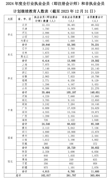截至2023年12月31日,执业会员人数102,017人,非执业会员人数261,787人,累计363,804人。