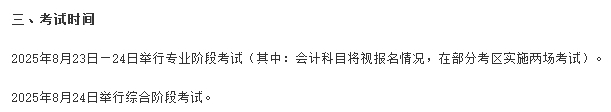 2025年8月23日-24日举行专业阶段考试(其中:会计科目将视报名情况,在部分考区实施两场考试);