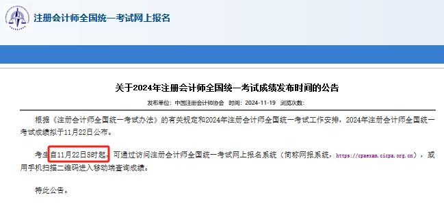 中国注册会计师协会发布的《关于2024年注册会计师全国统一考试成绩发布时间的公告》中提到,贵州2024年cpa成绩查询入口11月22日8点正式开通,考生可通过访问注册会计师全国统一考试网上报名系统(https://cpaexam.cicpa.org.cn)查询成绩。