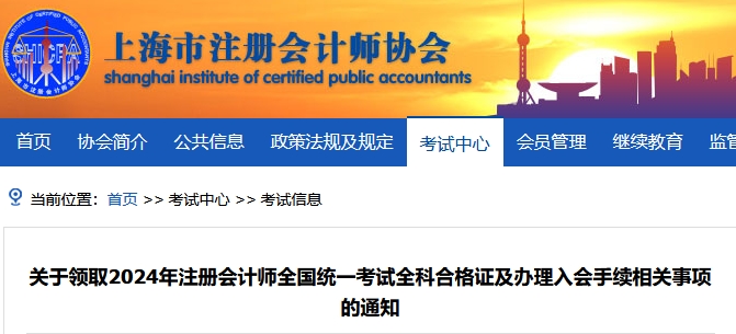 12月30日,上海注册会计师协会发布了《关于领取2024年注册会计师全国统一考试全科合格证及办理入会手续相关事项的通知》,其中提到:上海市2024年注册会计师全国统一考试全科合格证即日起开始领取。