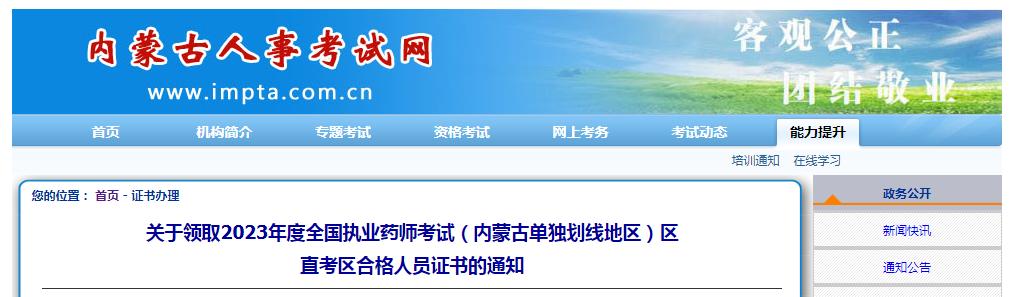 近日,内蒙古人事考试网发布了《关于领取2023年度全国执业药师考试(内蒙古单独划线地区)区直考区合格人员证书的通知》,从中得知,2023年内蒙古区直考区执业药师单独划线合格人员证书领取时间为2024年5月20日至22日,领取地点为内蒙古自治区人事考试院服务窗口,即呼和浩特市新城区中山东路团结巷2号,考生或可申请邮寄领取。