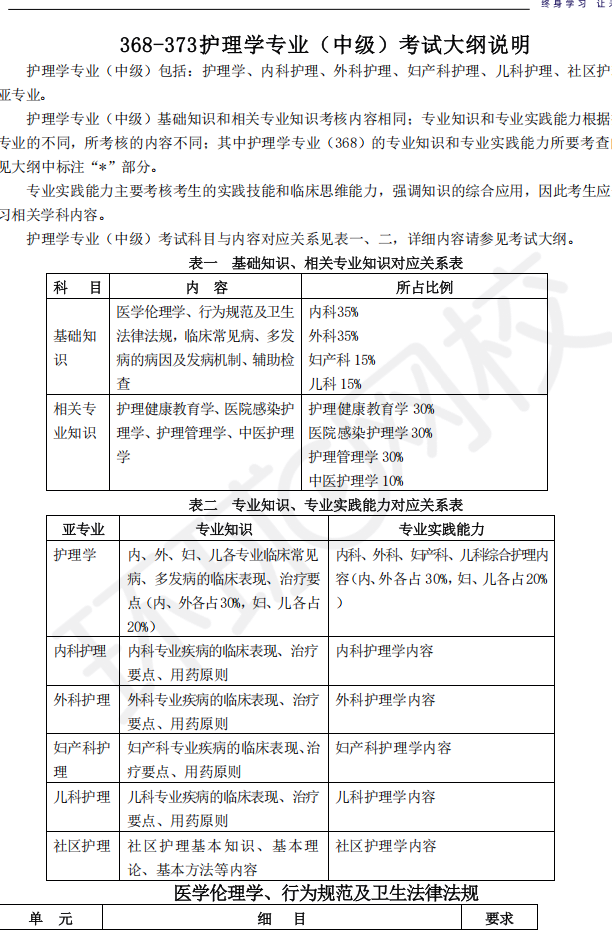 护理学专业(中级)基础知识和相关专业知识考核内容相同;专业知识和专业实践能力根据报考亚专业的不同,所考核的内容不同。其中,专业实践能力主要考核考生的实践技能和临床思维能力,强调知识的综合应用,因此考生应全面复习相关学科内容。