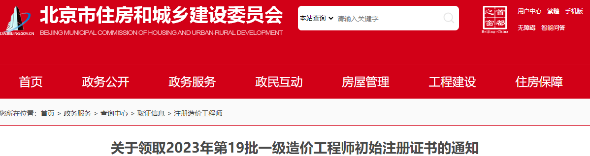 近日,北京市住房和城乡建设委员会发布了《关于领取2023年第19批一级造价工程师初始注册证书的通知》,其中明确北京市一级造价师初始注册证书已办结,相关人员可至北京市政务服务中心领取。