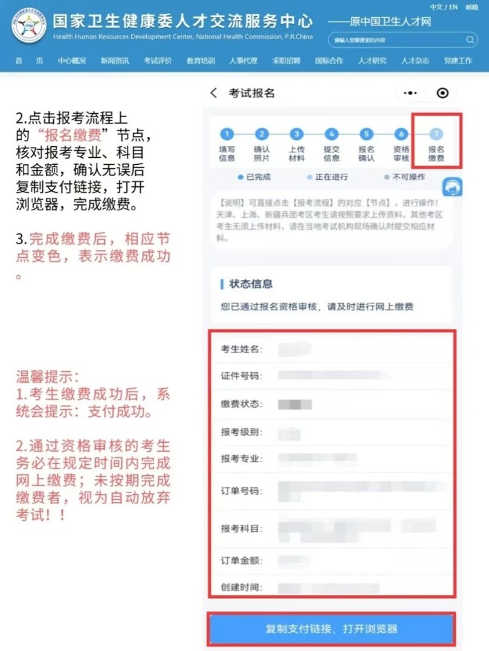 2、小程序端缴费流程:通过微信、百度或支付宝搜索“国家卫生健康委人才交流服务中心”小程序,登录后进入相应考试项目,点击报考流程上的“报名缴费”节点,核对信息后复制支付链接,打开浏览器完成缴费 。