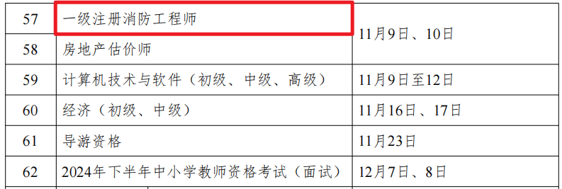 根据安徽省人事考试网发布的《关于2024年度专业技术人员职业资格考试工作计划及有关事项的通知》可知,安徽2024年一级消防工程师考试将于11月9日-10日举行。