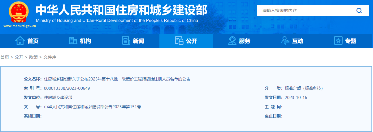 2023年10月23日,中华人民共和国住房和城乡建设部发布了《住房城乡建设部关于公布2023年第十八批一级造价工程师初始注册人员名单的公告》,其中明确共有4424人符合一级造价师初始注册条件,并对相关人员信息予以公告。