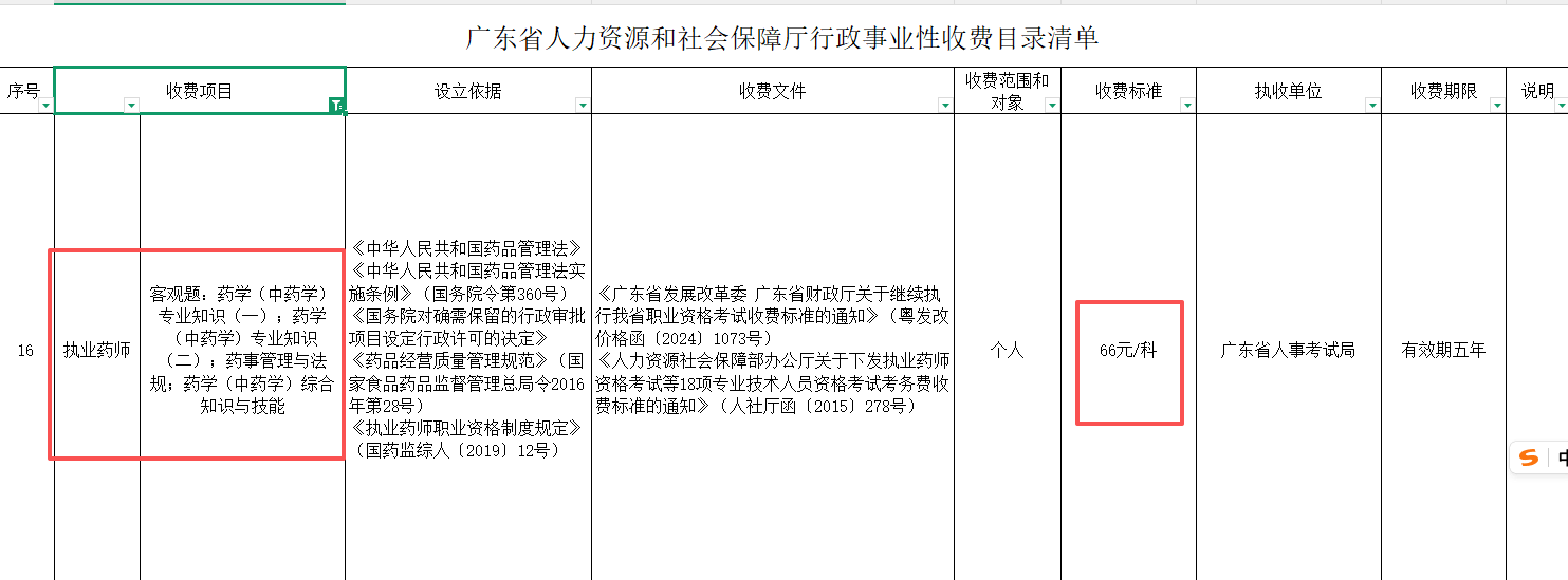 2026年2月25日,广东省人力资源和社会保障厅发布行政事业性收费目录清单,明确2026年执业药师职业资格考试收费标准为每人每科66元,执收单位为广东省人事考试局,收费期限有效期五年,该标准与2025年广东执业药师考试报名费保持一致,未作调整。