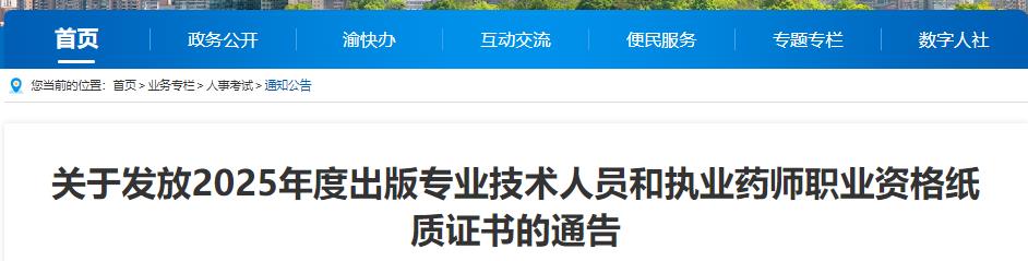 根据重庆市人事考试中心发布的“关于发放2025年度出版专业技术人员和执业药师职业资格纸质证书的通告”,2025年重庆执业药师证书领取时间为2026年1月20日——2月12日。详情如下: