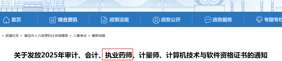 根据清远市人力资源和社会保障局发布的“关于发放2025年审计、会计、执业药师、计量师、计算机技术与软件资格证书的通知”,2025年广东清远执业药师证书于近期开始发放,请考试合格人员尽快领取。详情如下:
