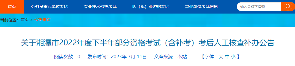 根据人力资源和社会保障部人事考试中心《关于印发〈专业技术人员职业资格考试报名证明事项告知承诺制工作规程〉的通知》(人考中心函〔2021〕1号)、省人力资源社会保障厅《关于专业技术人员资格考试实行考后资格审查的通知》(湘人社函〔2012〕526号)及有关考务通知文件精神,现将做好湘潭市2022年度下半年部分资格考试(含补考)考后人工核查补办工作有关事项公告如下: